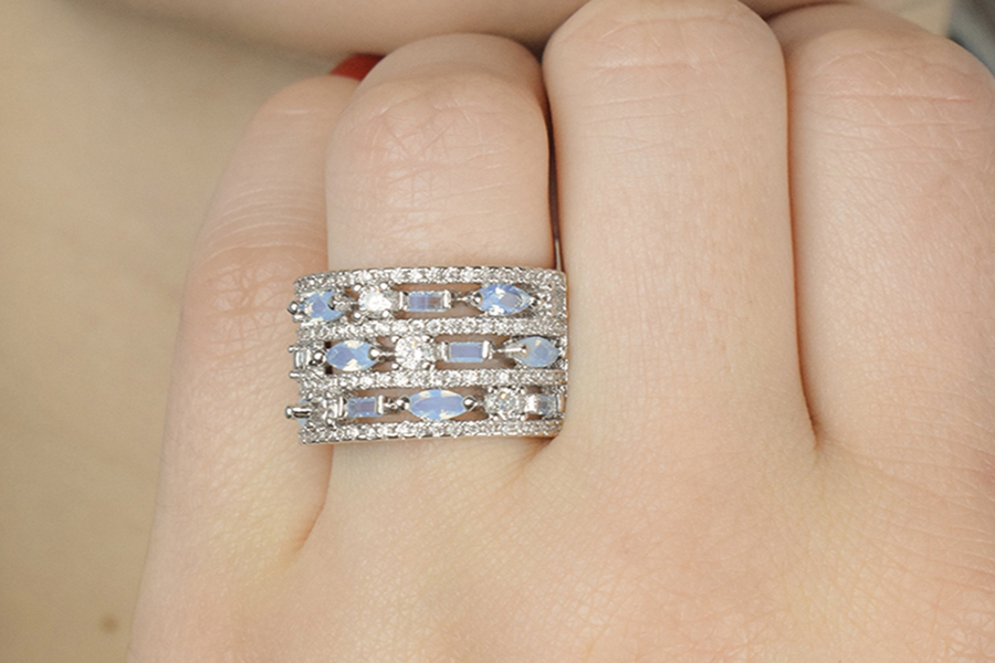 ANEL BANHADO EM RÓDIO BRANCO, QUADRADO 14mm COM 81 ZIRCÔNIAS