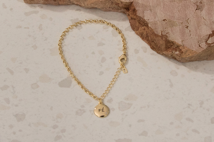 PULSEIRA INFANTIL BANHADA EM OURO, ELO DUPLO 1,80mm E CARTIER 3,50x1,90mm, 15cm COMPRIMENTO, CORAÇAO, ANJO E CHAVE