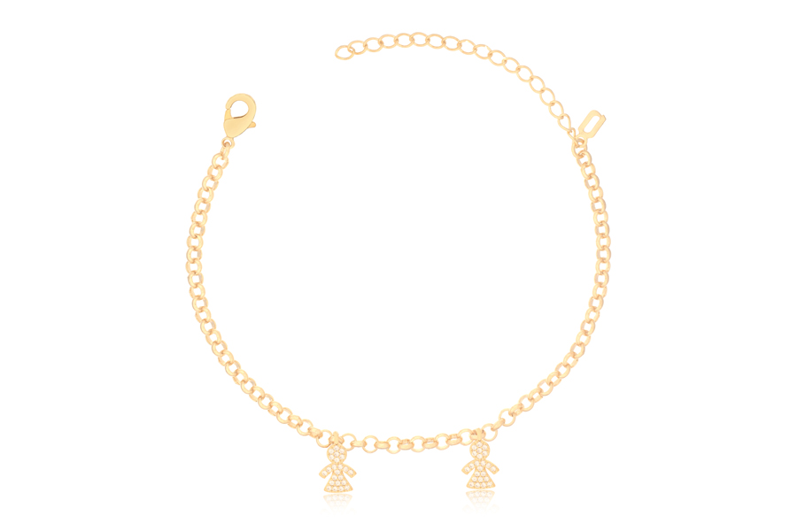 PULSEIRA BANHADA EM OURO, ELO PORTUGUÊS 3mm, ELO CORAÇÃO 4,20mm LARGURA, PINGENTE CORAÇÃO 11mm LARGURA COM MENINA