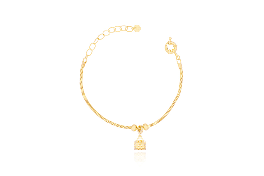 PULSEIRA INFANTIL BANHADA EM OURO, ELO 4,20x1,90mm, 14cm COMPRIMENTO, CHAVE, CADEADO E CORAÇÃO