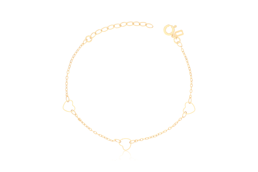 PULSEIRA INFANTIL BANHADA EM OURO, ELO DUPLO 1,80mm E CARTIER 3,50x1,90mm, 15cm COMPRIMENTO, CORAÇAO, ANJO E CHAVE