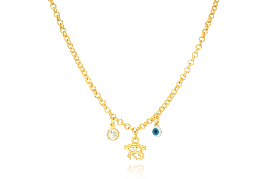 CHOKER BANHADA EM OURO, ELO PORTUGUÊS 2,50mm, 36cm COMPRIMENTO, OLHO GREGO 4mm, PONTO DE LUZ 4,50mm E OLHO DE HÓRUS
