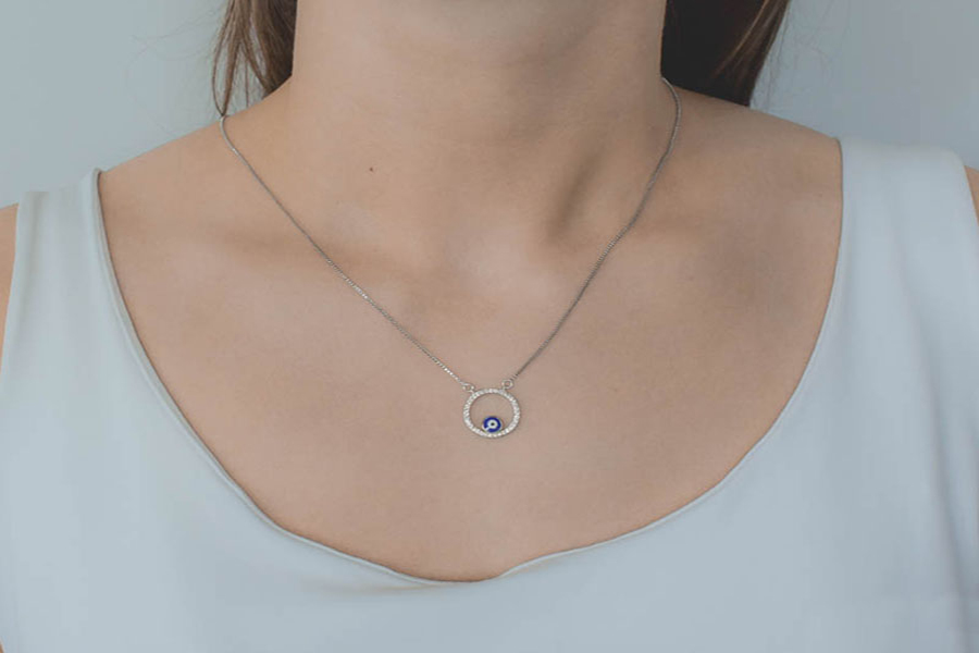 GARGANTILHA BANHADA EM RÓDIO BRANCO, ELO PORTUGUÊS 2mm, 40cm COMPRIMENTO E NOVE OLHOS GREGOS 4,50mm DIÂMETRO