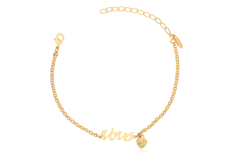 PULSEIRA BANHADA EM OURO, ELO PORTUGUÊS 3mm E 1,50mm, CORAÇÃO 7mm LARGURA, 17cm COMPRIMENTO
