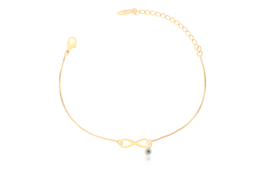 PULSEIRA BANHADA EM OURO, ELO PORTUGUÊS 2mm, 16cm COMPRIMENTO E TRÊS OLHOS GREGOS 4,50mm DIÂMETRO
