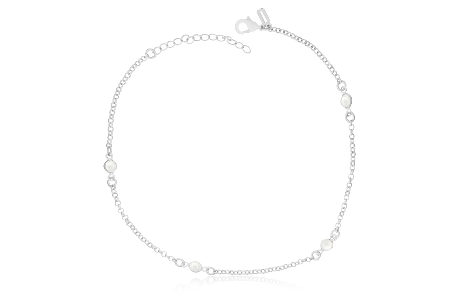 TORNOZELEIRA BANHADA EM PRATA LEVE, ELO PORTUGUÊS 2mm, 25cm COMPRIMENTO, EXTENSOR 4cm E 4 PÉROLAS
