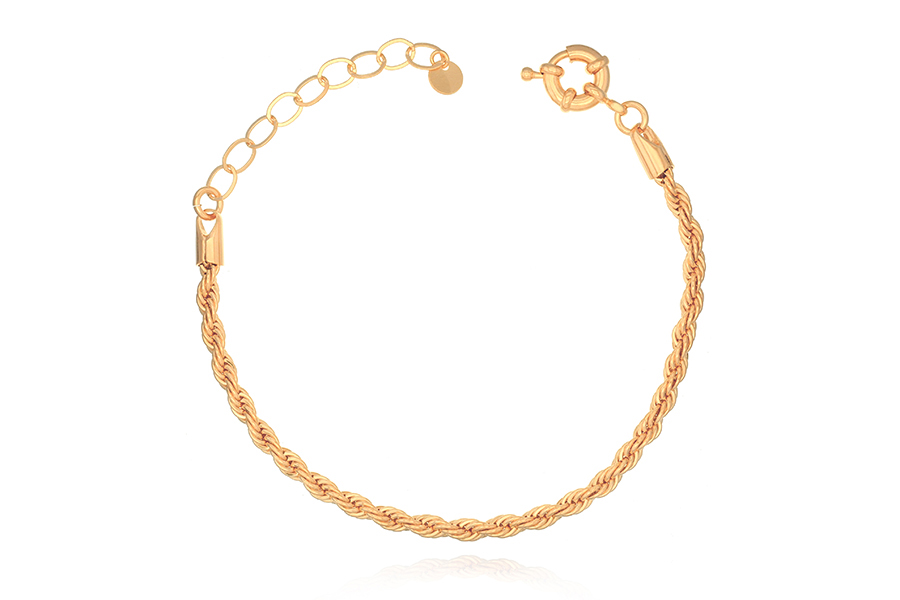 PULSEIRA BANHADA EM OURO, CORRENTE ELO CORDA 3mm ESPESSURA, 17cm COMPRIMENTO, EXTENSOR 5cm COMPRIMENTO E PESO 5,30g