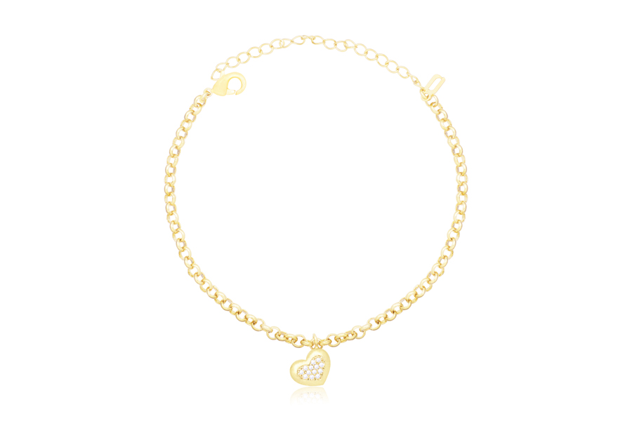 PULSEIRA BANHADA EM OURO, ELO PORTUGUÊS 3mm, ELO CORAÇÃO 4,20mm LARGURA, PINGENTE CORAÇÃO 11mm LARGURA COM MENINA